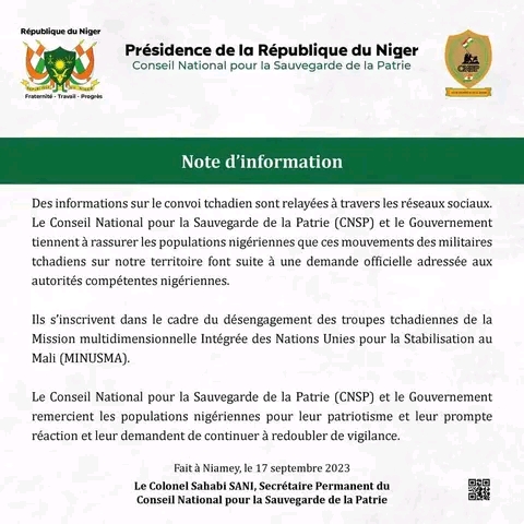 Dans une note d’information en date du dimanche 17 septembre 2023, le conseil National pour la Sauvegarde de la patrie (CNSP) donne des précisions sur la présence des soldats tchadiens au Niger. La junte militaire rassure les populations nigériennes et fait savoir que ces mouvements des militaires tchadiens sur le territoire nigérien font suite à une demande officielle adressée aux autorités compétentes nigériennes.