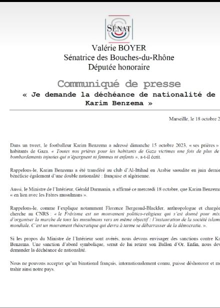La sénatrice Valérie Boyer est très remontée contre la star Karim Benzema. Elle a demandé ce mercredi 18 octobre 2023 le retrait du Ballon d’Or et la déchéance de nationalité de Benzema. Cette annonce intervient après que l’ancien attaquant vedette du Real Madrid ait pris position en faveur de la population palestinienne dans le conflit israélo-palestinien.