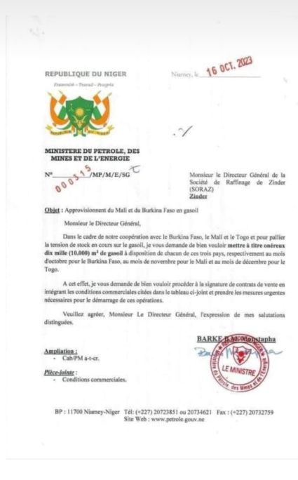 Le régime militaire au Niger a décidé d’approvisionner le Mali, le Burkina Faso et le Togo en gasoil. La décision a été actée à travers un communiqué signé du ministre du pétrole en date du lundi 16 octobre 2023. L’autorité ministérielle a instruit le Directeur Général de la société de raffinage de Zinder (SORAZ) de mettre à titre onéreux 10.000 m³ de gasoil à disposition de chacun de ces trois pays, respectivement au mois d’octobre pour le Burkina Faso, au mois de novembre pour le Mali et au mois de décembre pour le Togo.