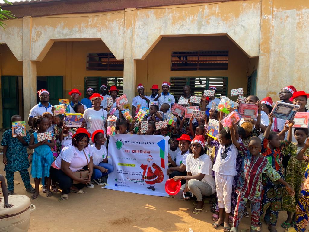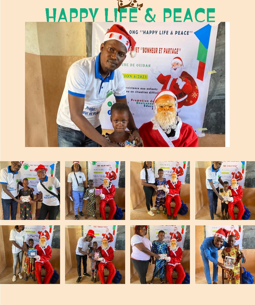Les enfants orphelins et ceux en situation difficiles de Kpassè dans la commune de Ouidah ont reçu le samedi 23 décembre dernier la visite d’un papa Noël pas comme les autres. En effet, l’Ong Happy Life & Peace Bénin a choisi en ces moments de fêtes de fin d’année d’égayer un temps soit peu le cœur de ces enfants démunis qui avaient besoin de chaleur familiale. Cette descente s’inscrit dans le cadre de la 6e édition du projet Bonheur et Partage de l’Ong Happy Life & Peace Bénin qui est un projet d’assistance et de soutien aux enfants orphelins et ceux démunis.
