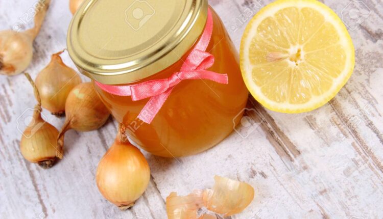 Mixer les oignons pour avoir le jus. Y ajouter un grand verre de jus de citron et 4 cuillérée à soupe de miel. Tout mélanger