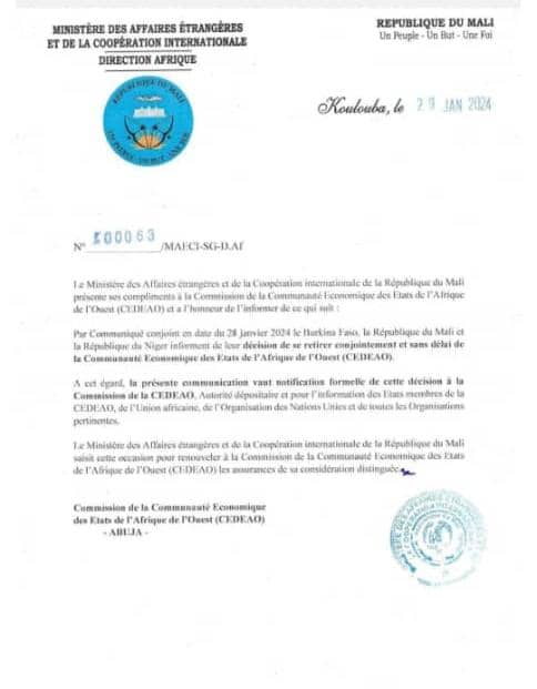 Hormis la note conjointe adressée hier dimanche 28 janvier 2024 à la Cedeao par le Mali, le Burkina Faso et le Niger pour leur retrait sans délai de l’organisation sous régionale, le Mali de Assimi Goïta à travers son ministère des affaires étrangères vient de saisir à nouveau la commission de la Cedeao pour le même motif. « La présente communication vaut notification formelle de cette décision à la Commission de la Cedeao ». La note est adressée également à l’Union Africaine et à l’Organisation des nations unies ainsi qu’à toutes les organisations compétentes affiliées