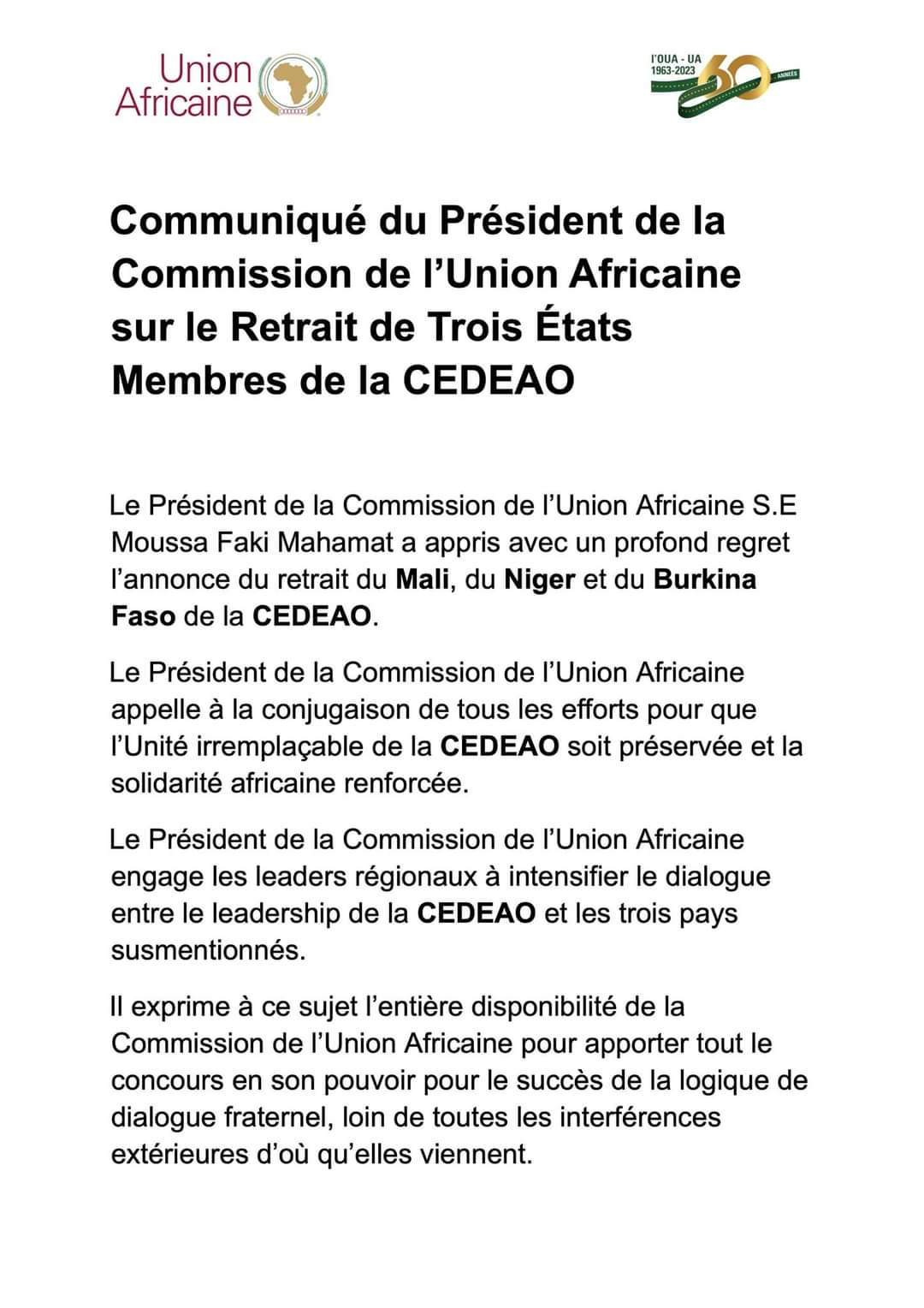 Le président de la Commission de l’Union Africaine Moussa Faki Mahamat a réagit suite au retrait du Mali, du Burkina Faso et du Niger de la Cedeao. Il dit avoir appris la nouvelle avec profond regret et appelle à la conjugaison de tous les efforts pour que l’unité irremplaçable de la Cedeao soit préservée et la solidarité africaine renforcée.