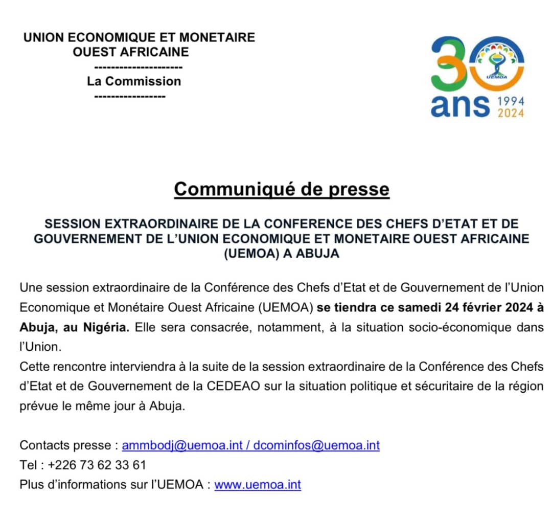 Deux sommets sont prévus ce samedi 24 février 2024 à Abuja au Nigeria. Il s’agit dans un premier temps du sommet extraordinaire de la Cedeao sur la situation politique et sécuritaire de la sous-région. Il sera suivi d’une Session extraordinaire de la Conférence des chefs d’État et de gouvernement de l’Uemoa qui sera consacrée notamment à la situation socio-économique dans l’union