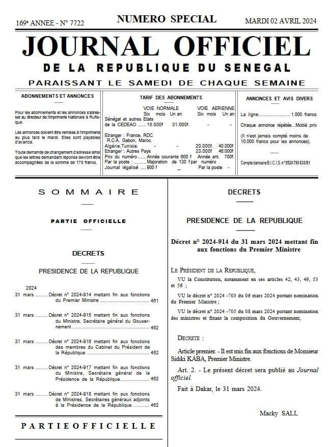 Dans un decret publié au journal officiel du Sénégal paru ce mardi 02 avril 2024, l’ex président Macky Sall a mis fin le 31 mars dernier aux fonctions de son premier ministre Sidiki Kaba y compris le Secrétaire général du Gouvernement Seydou Guèye. Macky Sall a également mis fin aux fonctions des membres de son cabinet.