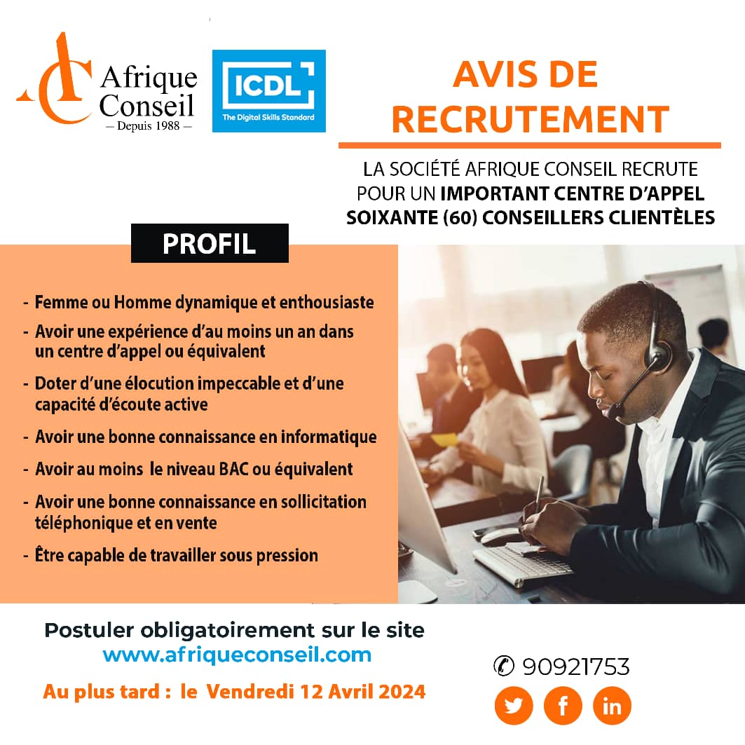 Postuler obligatoirement sur le site www.afriqueconseil.com au plus tard le vendredi 12 avril 2024.