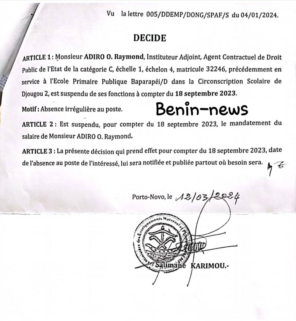 À travers une décision en date du 12 mars 2024 prise par le ministre des enseignements maternel et primaire Salimane KARIMOU, le sieur ADiRO O. Raymond instituteur à l’école primaire publique de Baparapeï/D dans la circonscription scolaire de Djougou 2 est suspendu de ses fonctions à compter du 18 septembre 2023. Ceci en raison de son absence « irrégulière » au poste, un motif grave qui porte atteinte au bon fonctionnement de l’école ainsi qu’au droit à l’éducation des élèves. En application de l’article 2, le mandatement du salaire de ADIRO O. Raymond est également gelé à partir de la même date, le 18 septembre 2023.