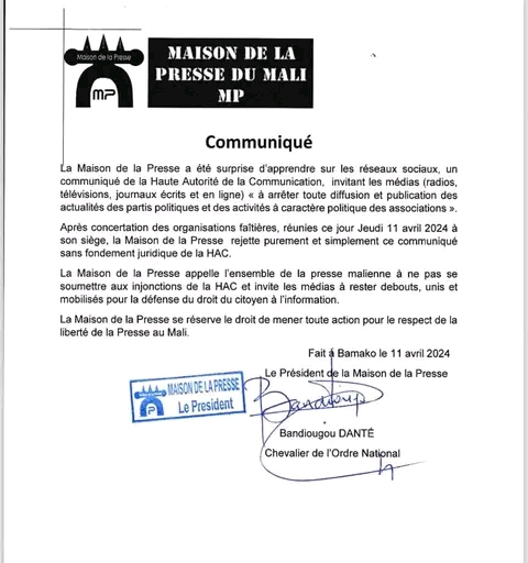 À travers un communiqué en date du jeudi 11 avril 2024 signé du président de la maison de presse, Bandiougou DANTE, les organisations faîtières de la presse au Mali rejettent le communiqué de la Haute Autorité de la Communication (HAC) portant sur l’arrêt de diffusion et de publication des activités des partis politiques et des activités à caractère politique des associations.
