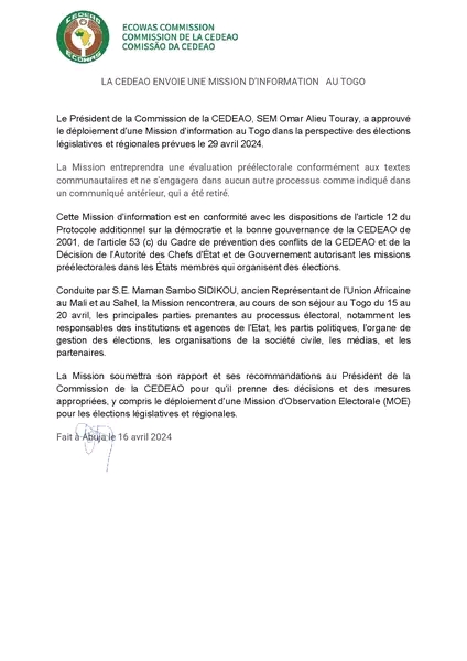 À travers un communiqué en date de ce mardi 16 avril 2024, la communauté Économique des États de l’Afrique de l’Ouest (CEDEAO) a envoyé une mission d’information au Togo dans le cadre des élections législatives et régionales. Le communiqué précise que cette mission d’information est en conformité avec les dispositions de l’article 12 du protocole additionnel sur la démocratie et la bonne gouvernance de la Cedeao de 2001, de l’article 53 du cadre de prévention des conflits de la Cedeao et de la Décision de l’Autorité des Chefs d’États et de Gouvernement autorisant les missions préélectorale dans les Etats membres qui organisent des élections.