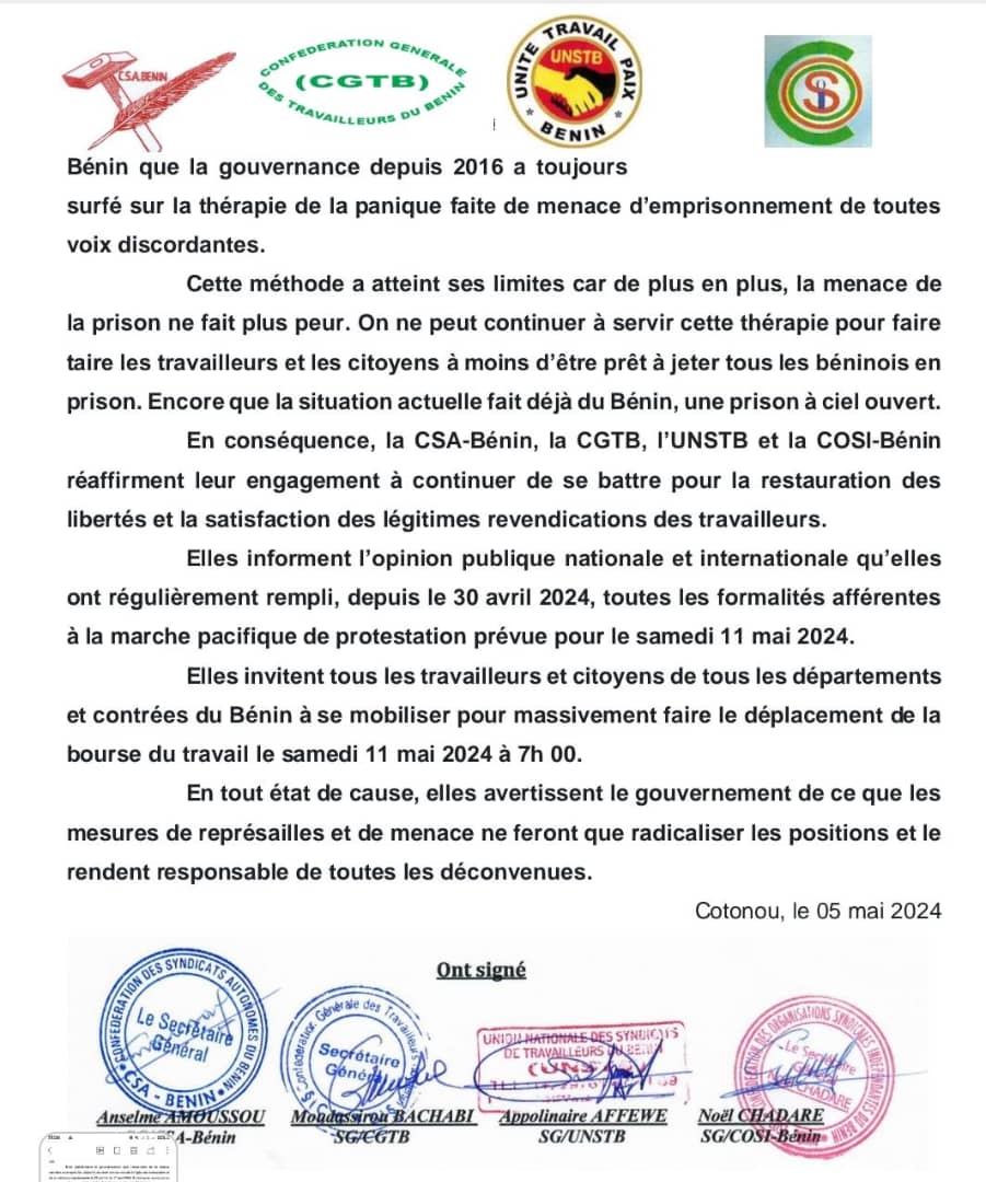 Des confédérations et centrales syndicales sont mécontentes suite à l’arrestation de leurs militants. La Csa-Bénin, le Cosi-Bénin, la Cgtb et l’Unstb « condamnent les dérives totalitaires du gouvernement et appellent à la libération immédiate et sans condition des 42 travailleurs encore gardés à vue » peut-on lire dans leur communiqué rendu public hier dimanche 05 mai 2024. Elles ont réitéré leur engagement ferme à se battre pour la restauration des libertés et la satisfaction des légitimes revendications des travailleurs. Elles invitent par la même occasion les travailleurs à une grande mobilisation à la bourse du travail le 11 mai prochain et avertissent le gouvernement que les mesures de représailles et de menaces ne feront que radicaliser les positions et le rendre responsable de toutes les déconvenues.