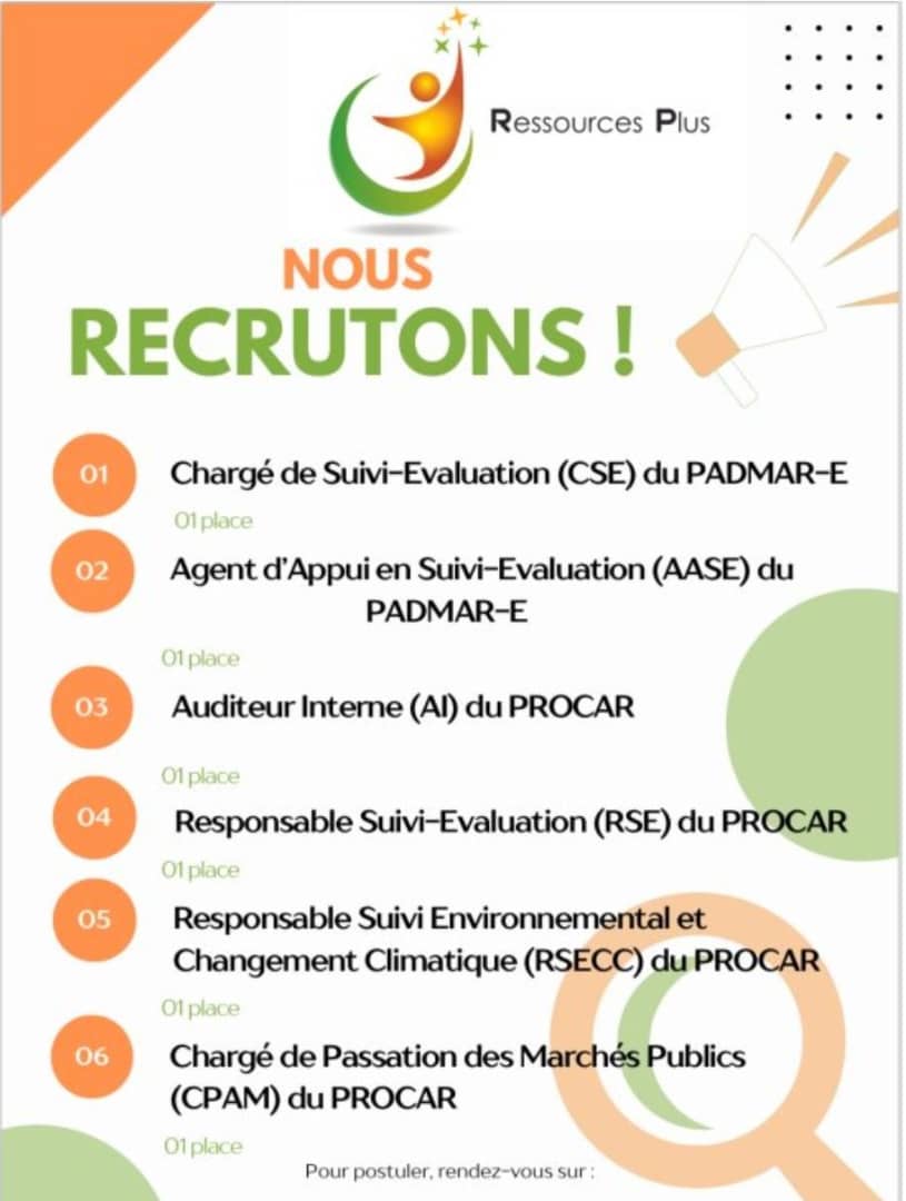 Dans le cadre d’un meilleur appui accompagnement des projets actifs du ProCaR et afin d’atteindre les objectifs de ces projets au profit des bénéficiaires à la base et ceci dans les délais d’exécution convenus entre les deux parties (Bénin et FIDA), li s’avère important de pourvoir à certains postes. C’est pourquoi, le MAEP lance le présent appel à candidature pour les postes ci-dessous décrits :