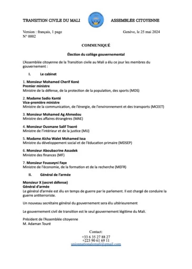 Des opposants maliens en exil ont formé un gouvernement de transition civile pour défier Assimi Goïta. Ainsi, plusieurs institutions sont formées grâce à cette initiative conduite par des opposants farouches au chef du régime militaire, le Colonel Assimi Goïta. L’initiative émane du » Panel des Démocrates Maliens” et la “Convergence pour une transition civile” qui a abouti à l’installation d’une assemblée citoyenne. Celle-ci a procédé le samedi 25 mai 2024, à la désignation des membres du gouvernement malien. Le magistrat Mohamed Chérif Koné est nommé Premier ministre. Il dirige également les portefeuilles de la Défense et des Sports. Adaman Touré est promu à la tête de l’Assemblée citoyenne. Selon ces opposants leur gouvernement civil de transition est le seul légitime du Mali. La justice malienne a ouvert une procédure contre les auteurs de cette initiative de défiance envers les autorités militaires du pays.
