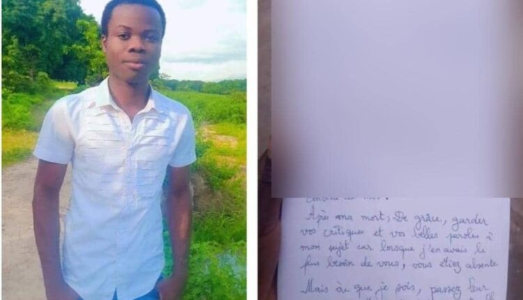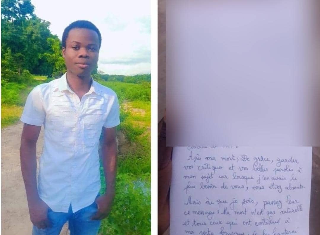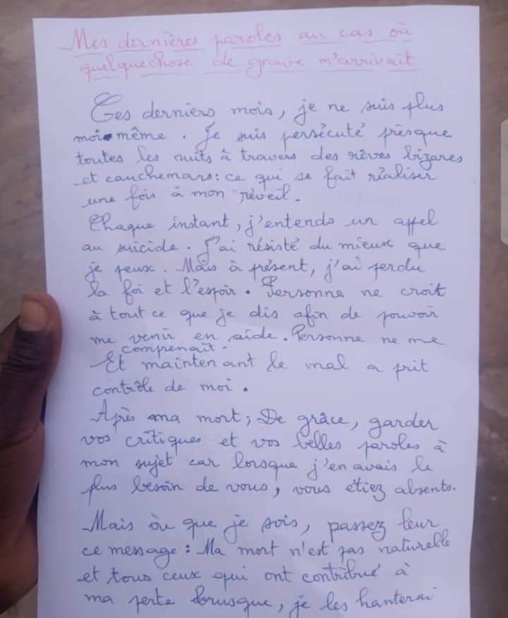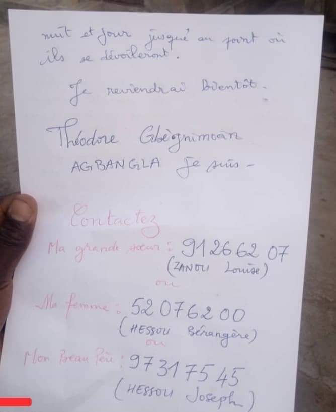 Dans une lettre retrouvée dans ses effets dont a connaissance « LibreInfo » le jeune enseignant a évoqué un problème spirituel et qu’il aurait reçu un appel incessant au suicide. Il aurait résisté en vain. »Ces derniers mois, je ne suis plus moi-même. Je suis persécuté presque toutes les nuits à travers des rêves bizarres et cauchemars : ce qui se fait réaliser une fois à mon réveil. Chaque instant, j’entends un appel au suicide. J’ai résisté du mieux que je peux. Mais à présent, j’ai perdu la foi et l’espoir. Personne ne croit à tout ce que je dis afin de pouvoir me venir en aide. Personne ne me comprenait. Et maintenant le mal a prit contrôle de moi. Après ma mort, de grâce, gardez vos critiques et vos belles paroles à mon sujet car lorsque j’en avais le plus besoin de vous, vous étiez absents. Mais où que je sois, passez leur ce message : ma mort n’est pas naturelle et tous ceux qui ont contribué à ma perte brusque, je les hanterai nuit et jour jusqu’au point où il se dévoileront. Je reviendrai bientôt. Théodore Gbègnimoan Agbangla je suis…’‘ peut-on lire dans la lettre.