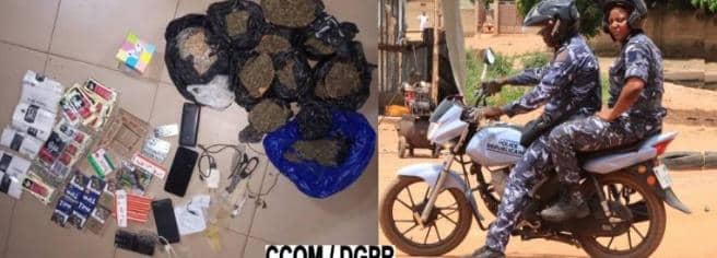 Parmi les découvertes réalisées lors du ratissage, on compte dix (10) emballages de chanvre Indien, plusieurs emballages de produits psychotropes tels que Tombo, Royal, Capitain black tobacco, We top, Rise. En plus produits prohibés, trois (03) téléphones portables et (03) trois motocyclettes d’origine douteuse ont également été saisis sur les lieux.