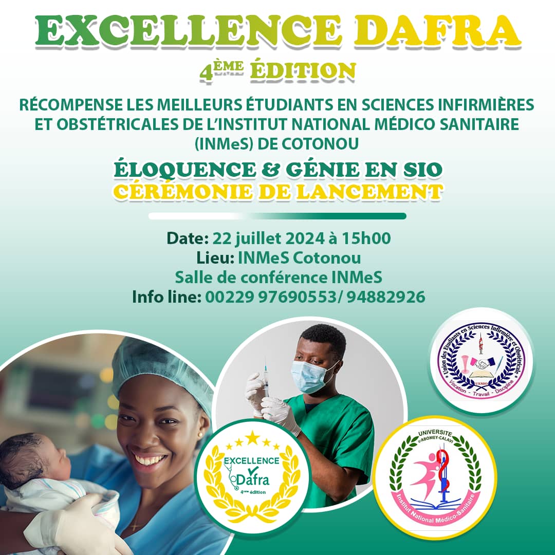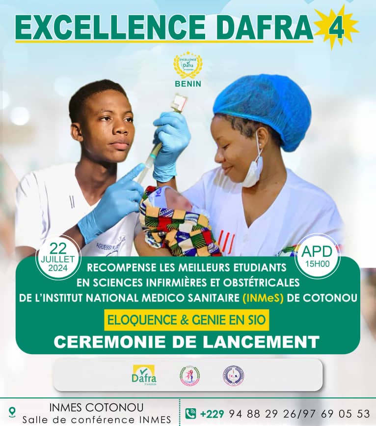 La 4e édition du projet Excellence Dafra sera officiellement lancée demain lundi 22 juillet 2024 à l’INMeS à Cotonou. L’objectif est de récompenser les meilleurs étudiants en sciences infirmières et obstétricales de l’INMeS.