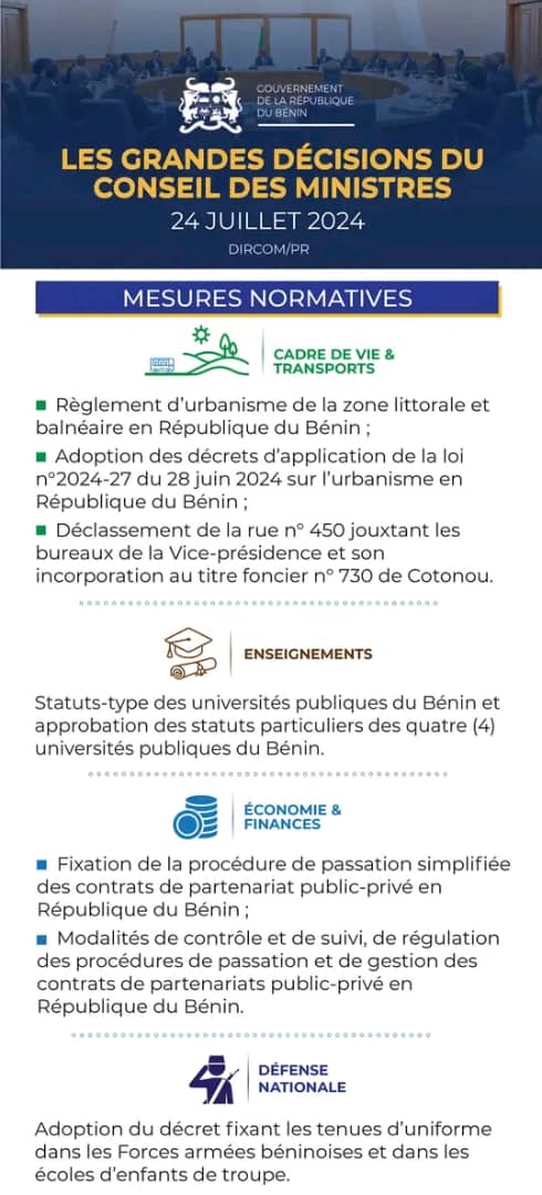 Le gouvernement s’est réuni en conseil des ministres ce mercredi 24 juillet 2024. À l’issue de ce rendez-vous hebdomadaire, plusieurs décisions ont été prises dont voici les grandes décisions.