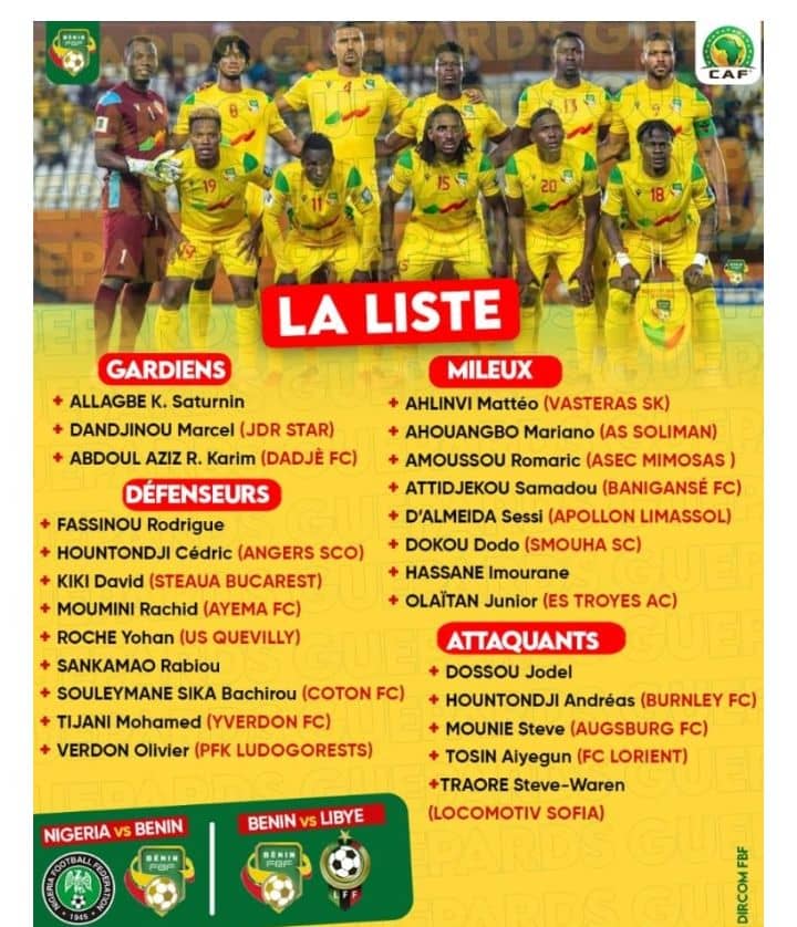 Au détour d’une conférence de presse qu’il a tenue ce jeudi 29 août 2024 dans la salle de conférence du stade Général Mathieu KEREKOU, le sélectionneur national des Guépards du Bénin Gernot Rohr a dévoilé la liste des joueurs convoqués pour les deux premières journées des éliminatoires CAN Maroc 2025. Dans la liste du technicien franco allemand, on note le retour de Steve Warren Traoré et de Andreas Hountondji et l’apparition de deux joueurs locaux dans au sein des Guépards. Il s’agit de Bachirou Sika de Cotonou FC et Samadou Attindjèkou de Bani Gansè FC. Il est à noter que les Guépards du Bénin vont défier les super eagles du Nigeria le 7 septembre avant de recevoir en côte d’ivoire la Lybie le 10 septembre 2024 (ci-dessous liste)