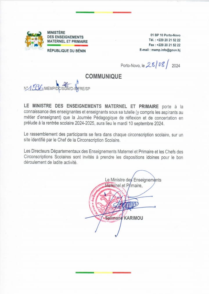 Dans un communiqué en date d’hier mercredi 28 août 2024, le ministre des enseignements maternel et Primaire Salimane Karimou porte à la connaissance des enseignantes et enseignants sous sa tutelle y compris les aspirants aux métier d’enseignement qu’il aura lieu le mercredi 10 septembre 2024 la journée de réflexion et de concertation en prélude à la rentrée 2024- 2025 dans chaque circonscription scolaire (ci-dessous, le communiqué du ministre)