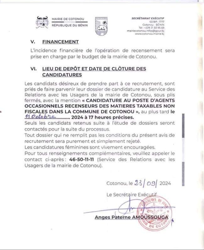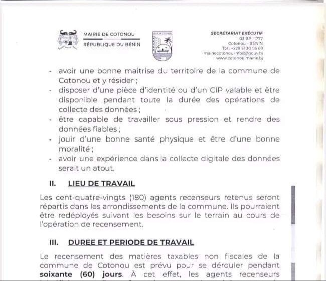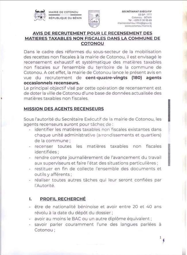 Dans le cadre des réformes du sous-secteur de la mobilisation des recettes non fiscales à la mairie de Cotonou, il est envisagé le recensement exhaustif et systématique des matières taxables non fiscales sur l’ensemble du territoire de la commune de Cotonou. À cet effet, la mairie de Cotonou lance le recrutement de 180 agents occasionnels recenseurs. Le principal objectif visé par l’opération est de doter la ville de Cotonou d’une base de données actualisées des matières taxables non fiscales. Lire ci-dessous l’intégralité du communiqué qui renseigne sur la mission des agents, le profil recherché, lieu et conditions de travail, etc.👇🏾