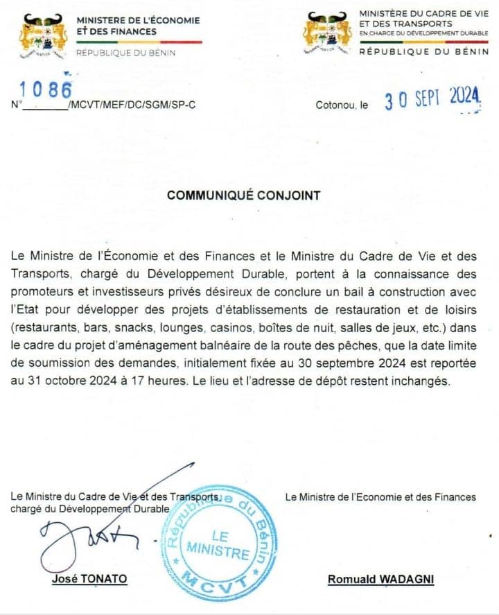 À travers un communiqué en date de ce lundi 30 septembre 2024 signé du Ministre de l’Économie et des Finances et son homologue du Cadre de vie et dès Transports, chargé du Développement Durable, il est porté à la connaissance des promoteurs et investisseurs privés désireux de conclure un bail à construction avec l’État pour développer des projets d’établissements de restauration et de loisirs (Restaurants, Bars, Snacks, Lounges, Casinos, Boîtes de nuit, Salles de jeux, …etc.) dans le cadre du projet d’aménagement balnéaire de la route des pêches, que la date limite de soumission des demandes, initialement fixée au 30 septembre 2024 est reportée au 31 octobre 2024 à 17 heures. Lire ci-dessous le communiqué