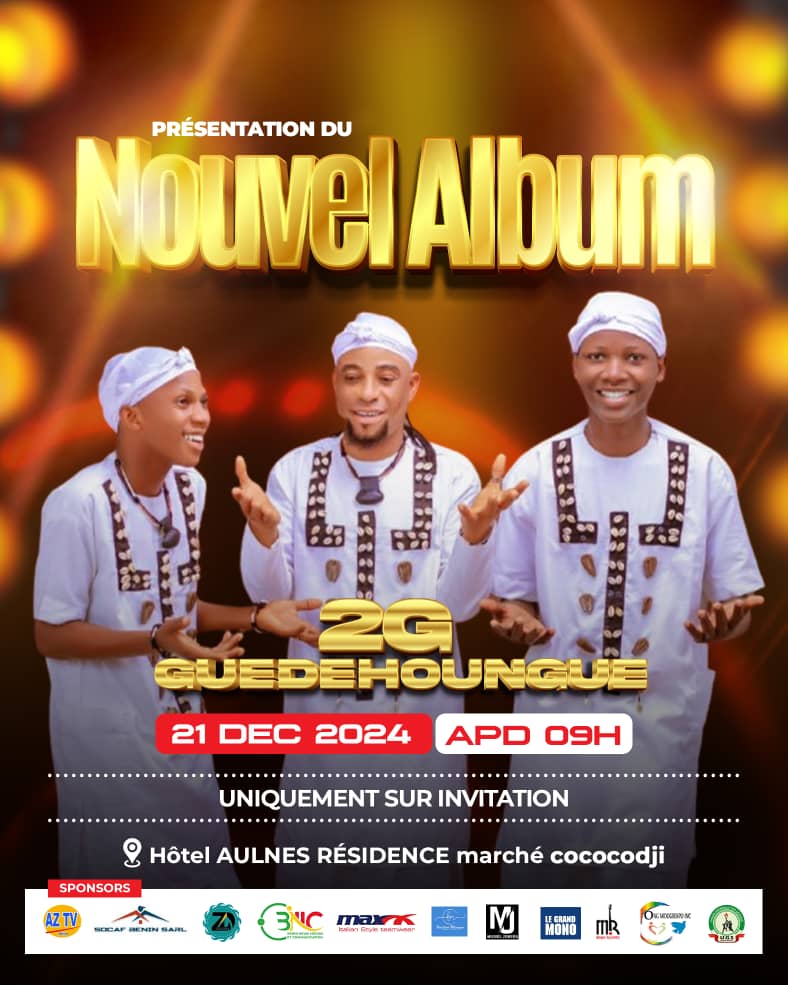 www.benin-news.com– Suivant les pas de leurs aînés, les légendaires Frères Guèdèhounguè, le groupe 2G Guèdèhounguè dévoile son tout nouvel album le weekend prochain. Ils invitent leurs fans et le public à un événement exceptionnel le samedi 21 décembre 2024, à partir de 9h, à l’Hôtel Aulnes Résidence, situé derrière le marché Cococodji. À cette occasion, le groupe dévoilera en exclusivité son nouvel album audio et vidéo.