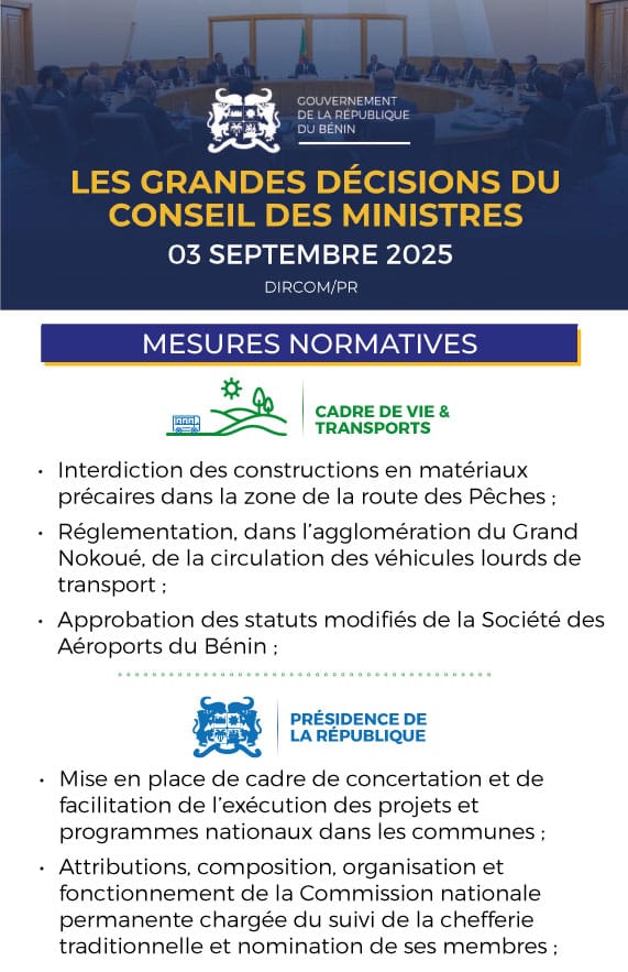 Le conseil des ministres s’est réuni en sa séance hebdomadaire ce mercredi 3 septembre 2025. Plusieurs décisions ont été prises dont voici les grandes lignes 👇