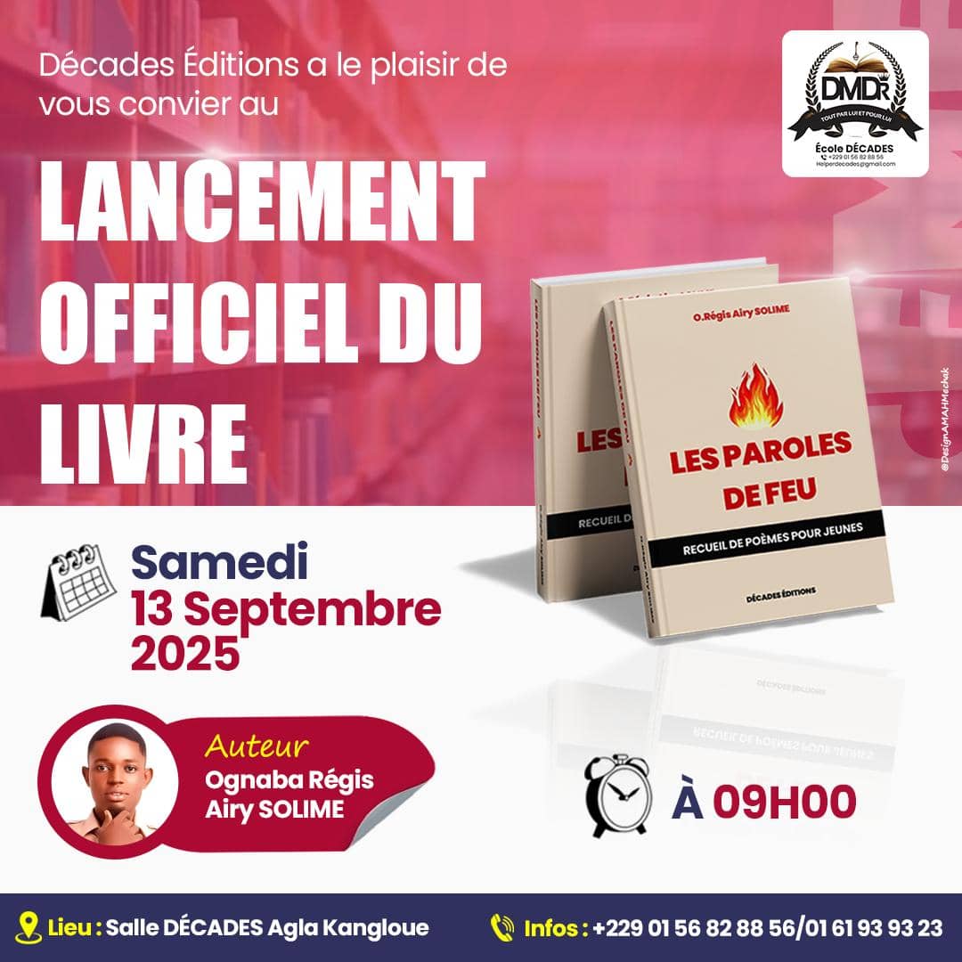 Un nouveau souffle littéraire s’annonce dans le paysage éducatif et spirituel du Bénin. Ce samedi 13 septembre 2025 à 09 heures précises, Décades Éditions procédera au lancement officiel de « Les Paroles de Feu », le tout premier recueil de poèmes du jeune auteur Ognaba Régis Airy SOLIME. L’événement aura lieu dans la salle décades à Agla Kangloué.