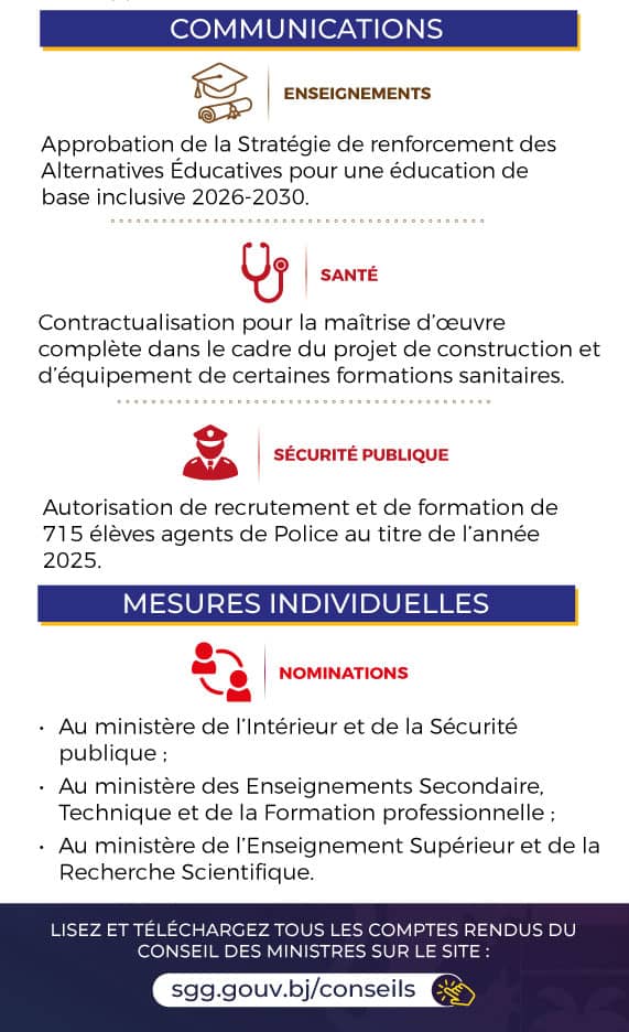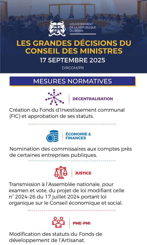 Le conseil des ministres s’est réuni en sa séance hebdomadaire de ce mercredi 17 septembre 2025. Plusieurs décisions ont été prises dont voici les grandes lignes 👇