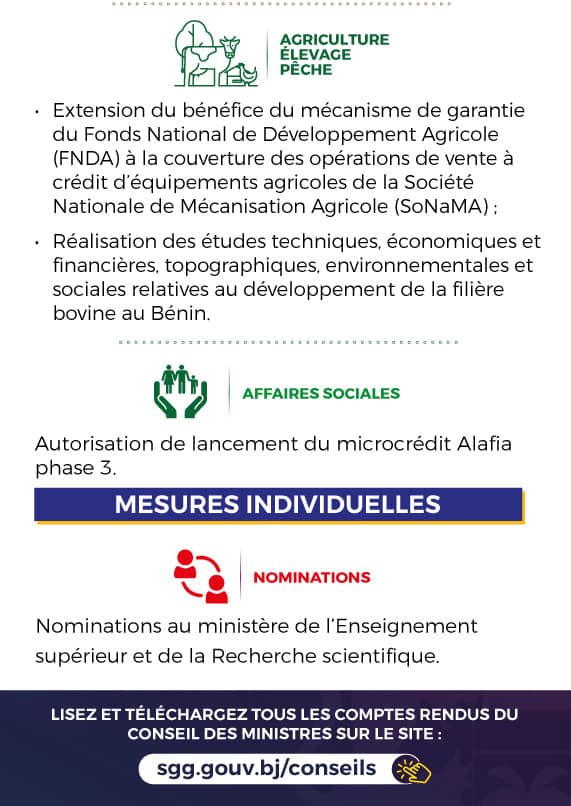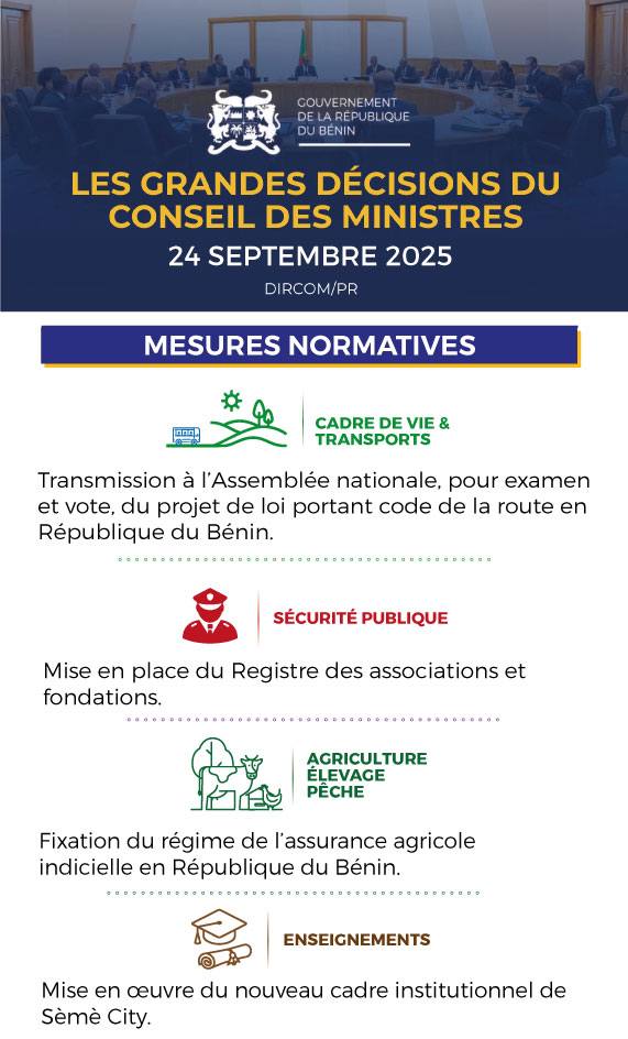 Le conseil des ministres s’est réuni ce mercredi 24 septembre au Palais de la Marina sous la présidence de Patrice Talon. Plusieurs décisions importantes ont été prises dont voici les grandes lignes 👇