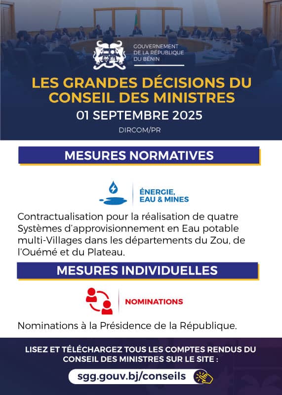 Le conseil des ministres s’est réuni ce mercredi 1er octobre 2025. Plusieurs décisions ont été prises dont voici les grandes lignes 👇