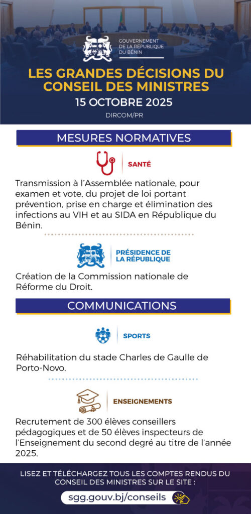 Le conseil des ministres s’est réuni en sa séance hebdomadaire ce mercredi 15 octobre 2025 sous la présidence de Patrice Talon. Plusieurs décisions ont été prises dont voici les grandes lignes 👇