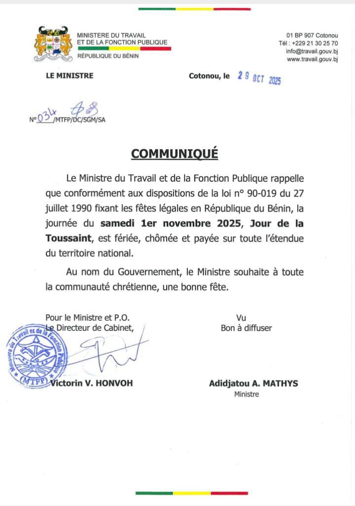 À l’occasion de la fête de la Toussaint, le gouvernement béninois informe les travailleurs et employeurs que la journée du samedi 1er novembre 2025 sera officiellement fériée, chômée et payée sur toute l’étendue du territoire national, conformément à la loi en vigueur. Le Ministre du Travail et de la Fonction Publique adresse, à cette occasion, ses vœux de bonne fête à la communauté chrétienne. Lire l’intégralité du communiqué ci-dessus 👇