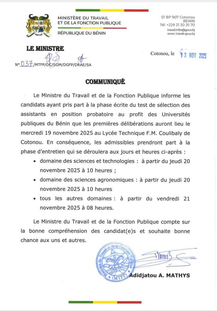 Le Ministère du Travail et de la Fonction Publique annonce la tenue des premières délibérations du test de sélection des assistants en position probatoire au profit des universités publiques du Bénin. Selon le communiqué officiel, cette étape décisive est prévue pour le mercredi 19 novembre 2025 au Lycée Technique F.M. Coulibaly de Cotonou.