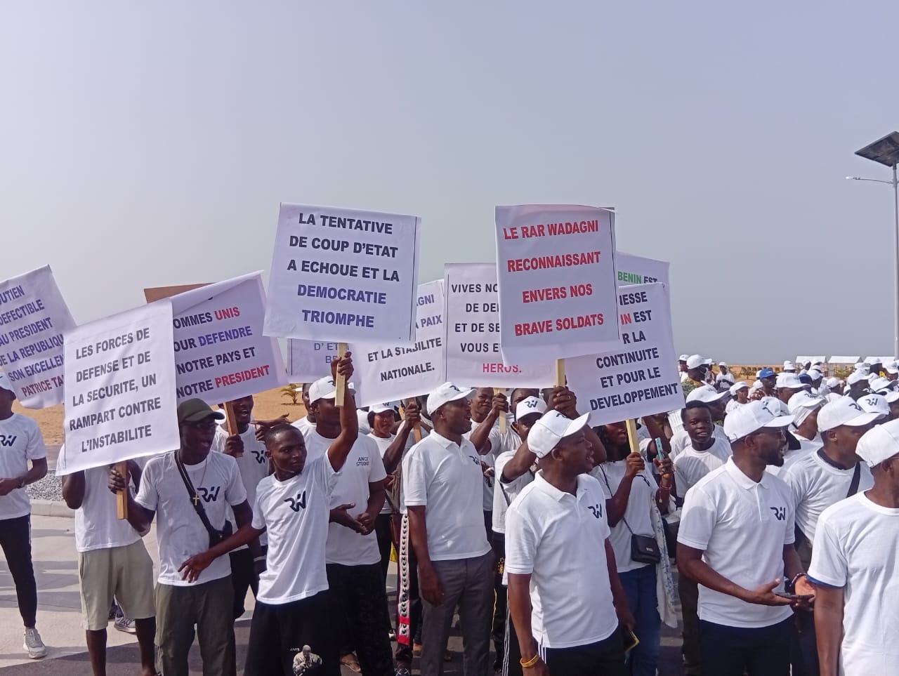 Conduit par son président, Curiace Hadonou, le RAR Wadagni s’est distingué par une organisation rigoureuse et une mobilisation massive de la jeunesse. Tout au long du parcours, ses membres ont porté des pancartes aux messages explicites : « Vives nos forces de défense et de sécurité, vous êtes nos héros », « La tentative de coup d’État a échoué et la démocratie triomphe », « La jeunesse du Bénin est pour la continuité et pour le développement » ou encore « RAR Wadagni reconnaissant envers nos braves soldats ». Un message revenait avec insistance : « Plus jamais de coup d’État au Bénin ».
