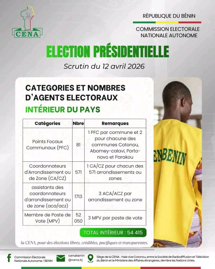 Dans le cadre de l’élection présidentielle du 12 avril 2026, la Commission électorale nationale autonome (CENA) a présenté les différentes catégories ainsi que le nombre d’agents électoraux déployés sur l’ensemble du territoire national.