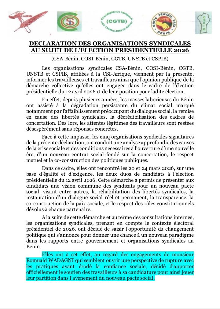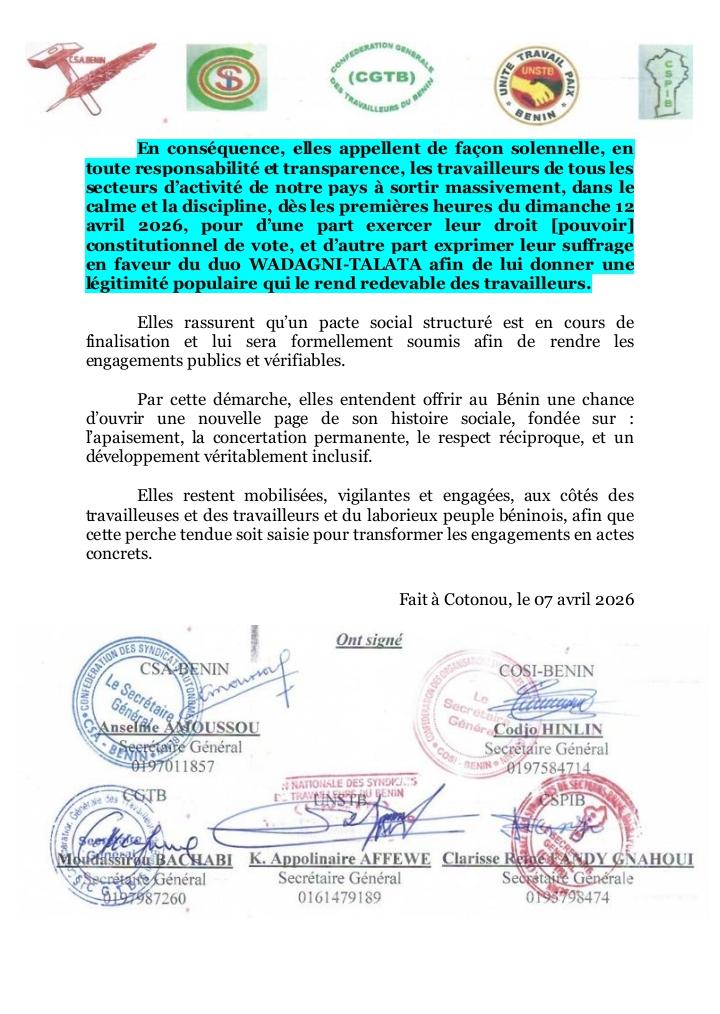 À l’approche de l’élection présidentielle du 12 avril 2026, plusieurs confédérations syndicales ont rendu publique, ce mardi 7 avril 2026, une déclaration dans laquelle elles apportent leur soutien au duo Wadagni–Talata. Elles appellent, par la même occasion, les travailleuses et les travailleurs à porter leur choix sur ce duo lors du scrutin du dimanche 12 avril 2026. Il s’agit de : la CSA-Bénin, la COSI-Bénin, la CGTB, l’UNSTB et la CSPIB. Lire ci-dessous l’intégralité de leur déclaration 👇
