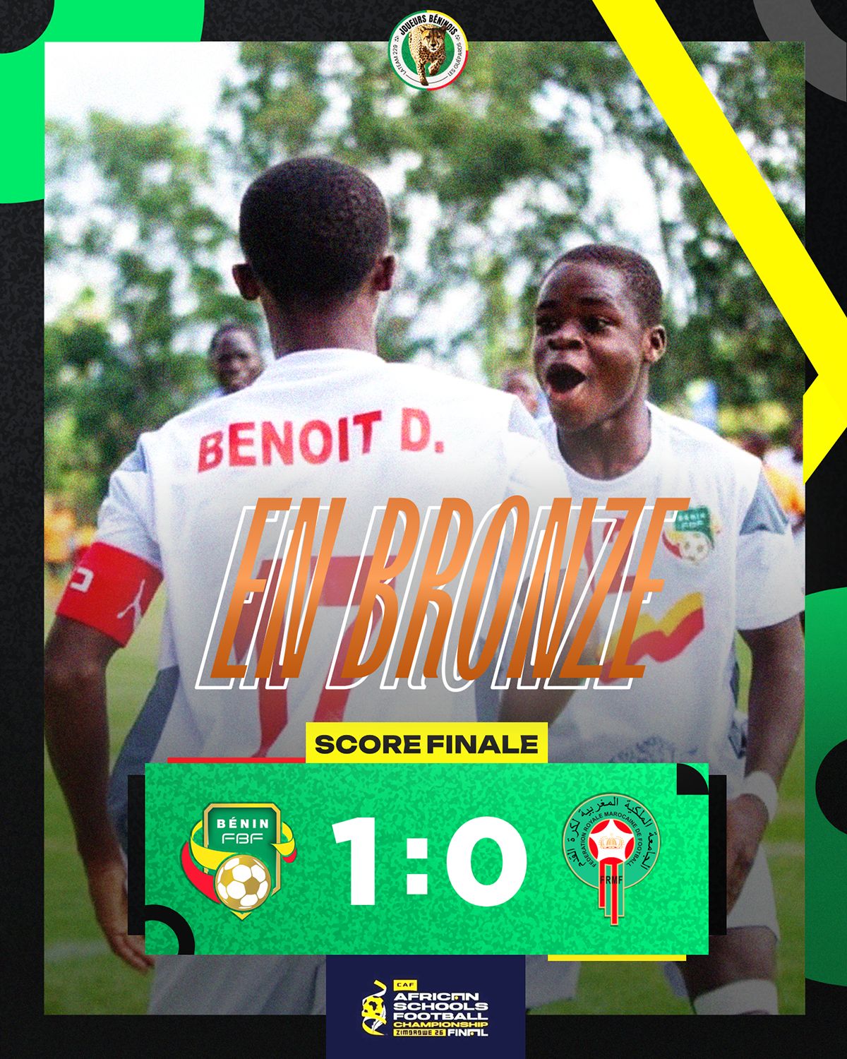 Le Bénin a signé une performance remarquable en s’adjugeant la médaille de bronze à la CAN scolaire U15, après sa victoire 1-0 face au Maroc lors du match de classement ce vendredi 10 avril 2026.