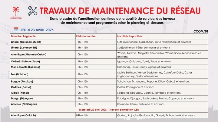 Par ailleurs, il est à noter que des travaux d’entretien de la Communauté Électrique du Bénin (CEB) sont en cours ce mercredi 22 avril 2026 dans la zone de Ouidah (Atlantique), de 9h à 16h, affectant des localités telles que Gbènà, Adjakè, Godonoutin, Gakpé, Pahou et Tovè.