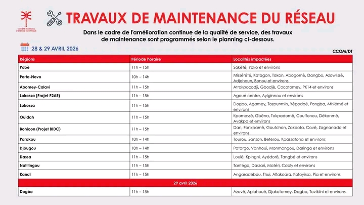 Le mardi 28 avril 2026, les zones de Pobè (Sakété, Yoko et environs) seront impactées de 11h à 15h. À Porto-Novo, les quartiers Missérété, Katagon, Takon, Abogomè, Dangbo, Azowlissè, Adjohoun, Bonou et leurs environs connaîtront des perturbations de 10h à 14h.